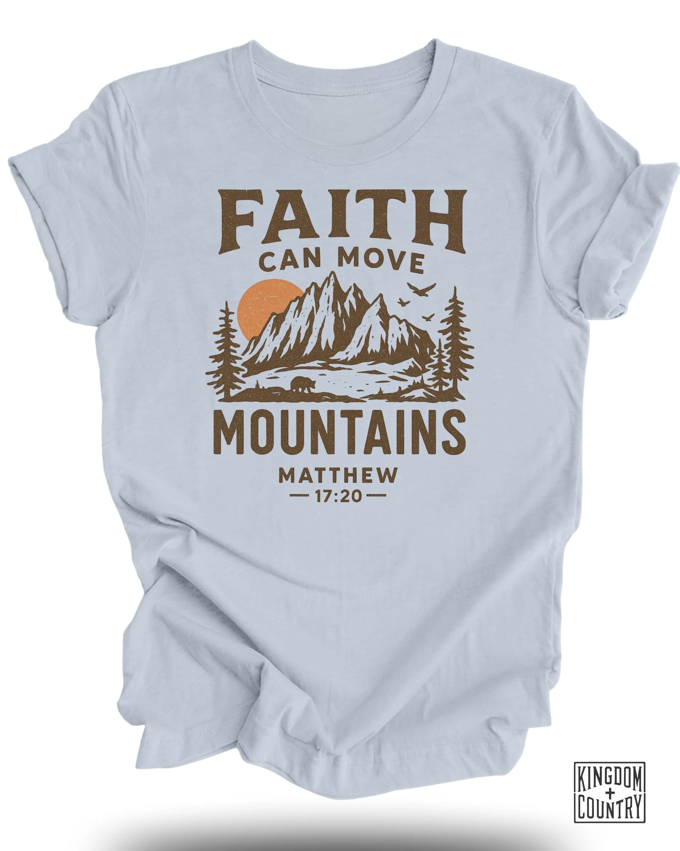 Embrace faith and nature with this inspiring T-Shirt. Featuring a scenic mountain landscape, complete with trees, a bear, and birds, this design is perfect for outdoor enthusiasts. The powerful message "Faith Can Move Mountains" from Matthew 17 20 adds a touch of inspiration. This shirt makes a thoughtful gift for Christians, nature lovers, and anyone seeking encouragement.