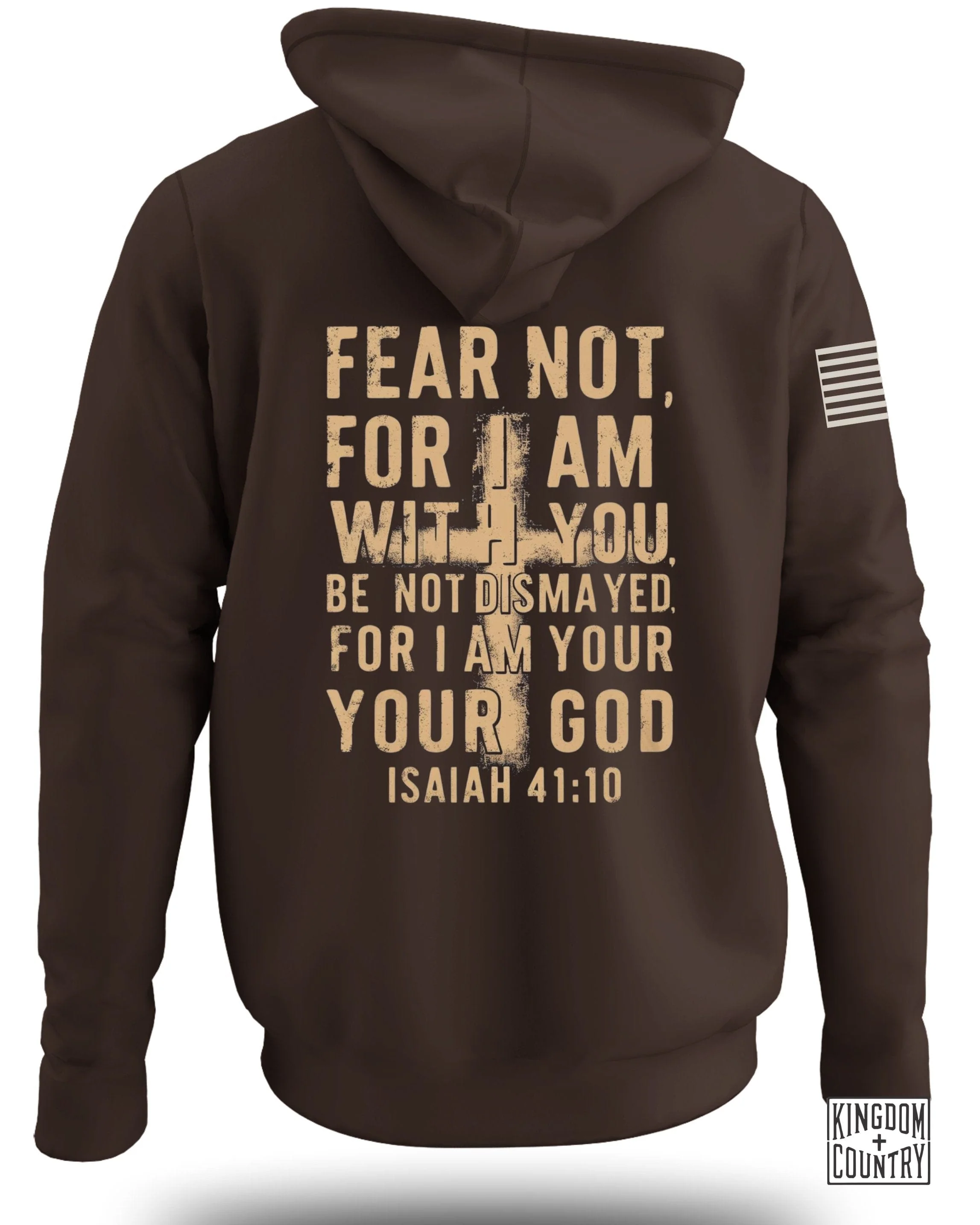 Embrace faith and comfort with this inspiring hoodie. Featuring a powerful message from Isaiah 41:10, "Fear not, for I am with you; be not dismayed, for I am your God." This design incorporates a subtle cross element within the text, providing a meaningful reminder of hope and strength. A perfect wearable testament to your beliefs.