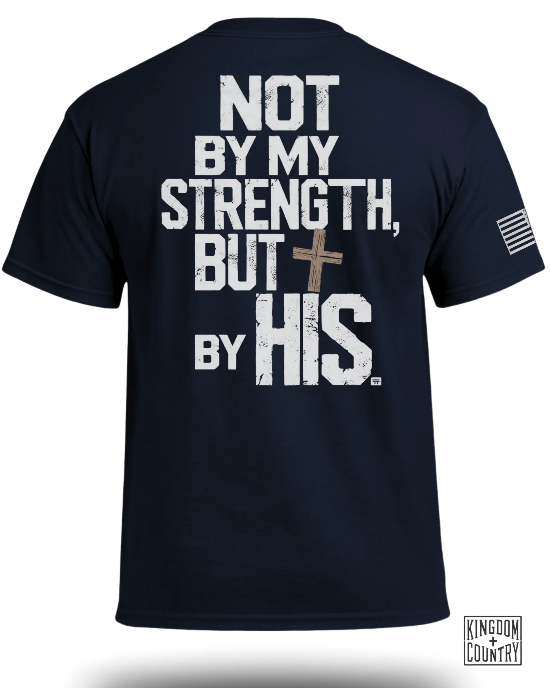 This T-Shirts product features a powerful message of faith. The design displays the text "Not By My Strength, But By His" with a wooden cross incorporated into the message. It's a great way to express your Christian beliefs and inspire others.