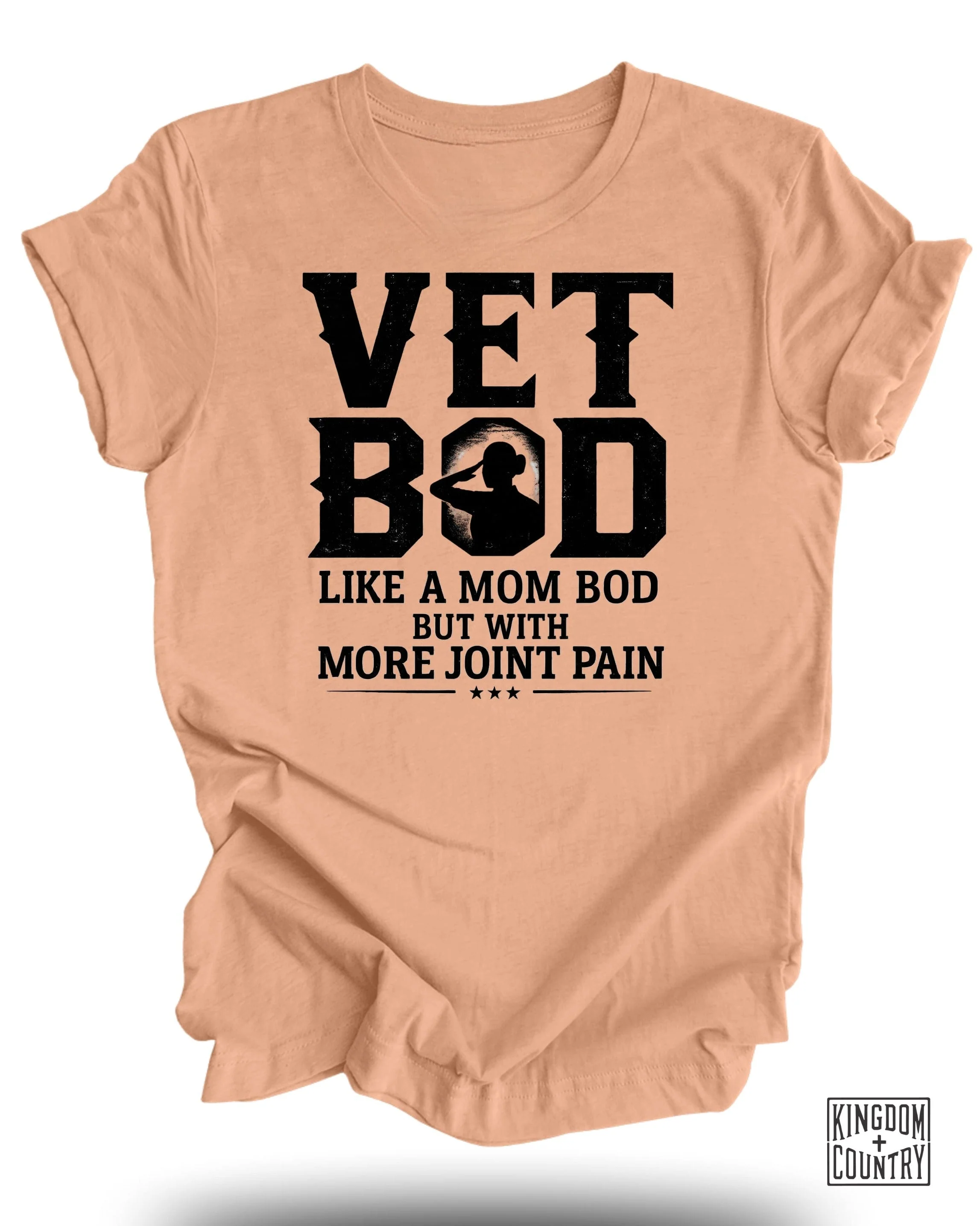 This T-shirt features the phrase "Vet Bod" with a silhouette of a saluting female veteran. Below, the text reads, "Like a Mom Bod But With More Joint Pain," adding a touch of humor to the design. Three stars complete the look.